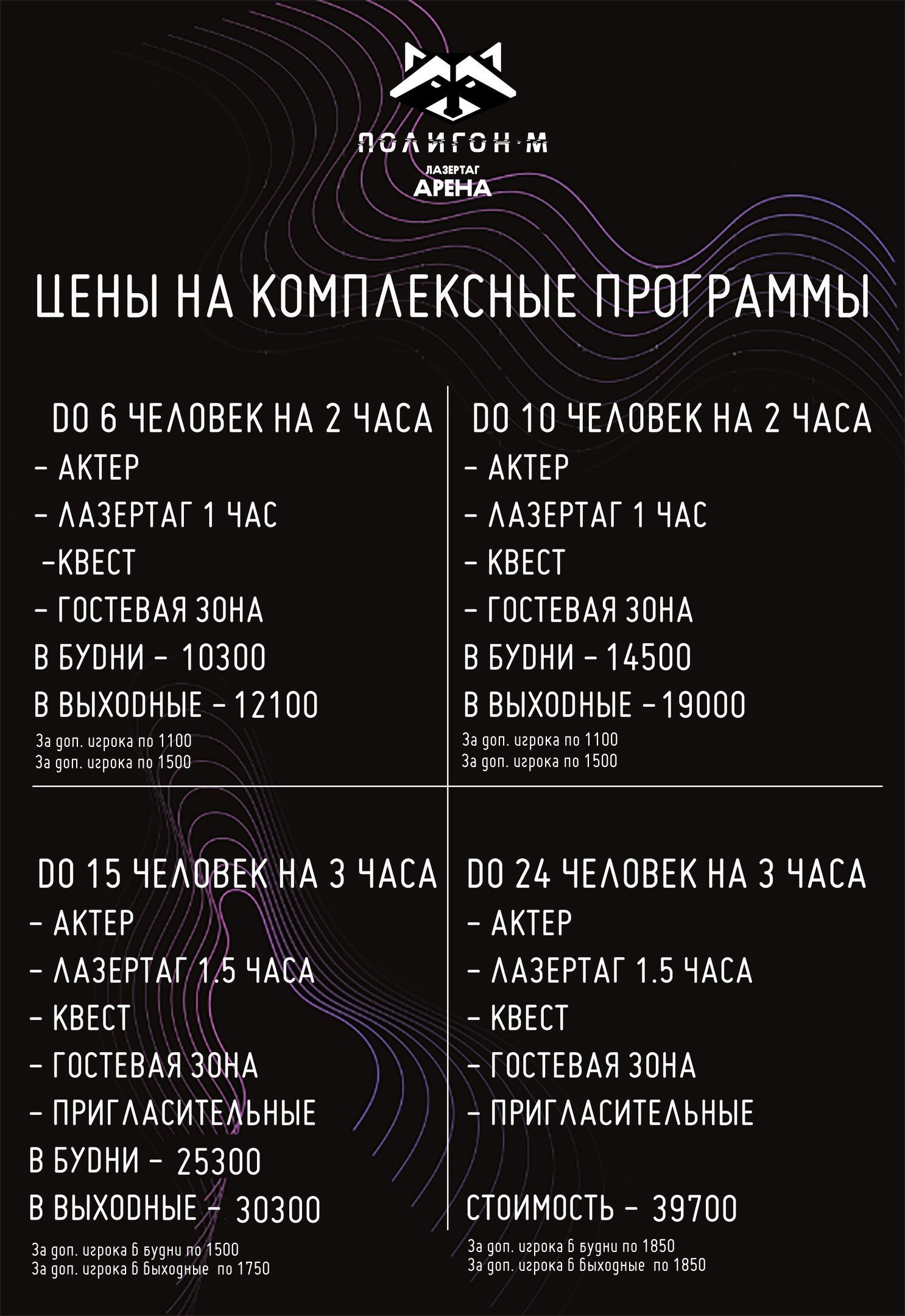 В традиционные игры лазертаг в Полигон-М, в нашем клубе, входят фотоотчёт, гостевая на 45 минут, камера хранения, все удобства гостевой комнаты. Отдельно можем договориться об организации дискотеки, квестов, развлекательных программ и об оформлении пространства клуба под ваш праздник.